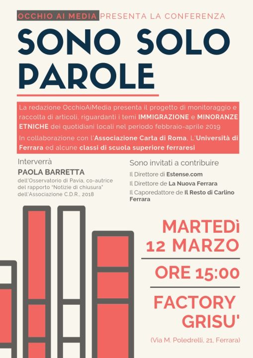 Il 12 Marzo 2018, alle ore 15, la redazione Occhio Ai Media presenta il progetto di monitoraggio e raccolta di articoli che toccano i temi IMMIGRAZIONE e MINORANZE ETNICHE dei quotidiani locali di Ferrara nel periodo febbraio-aprile 2019. In collaborazione con l'Associazione Carta di Roma, L'Università di Ferrara ed alcune classi di scuola superiore ferraresi. Interverrà PAOLA BARRETTA dell'Osservatorio di Pavia, co-autrice del rapporto “Notizie di chiusura” Sesto rapporto dell'Associazione CARTA DI ROMA, 2018. Sono invitati a contribuire: - Il Direttore di Estense.com - Il Direttore de la Nuova Ferrara - Il Caporedattore de Ferrara - Il Resto del Carlino Saranno inoltre presentati i risultati parziali del monitoraggio effettuato nel primo mese.