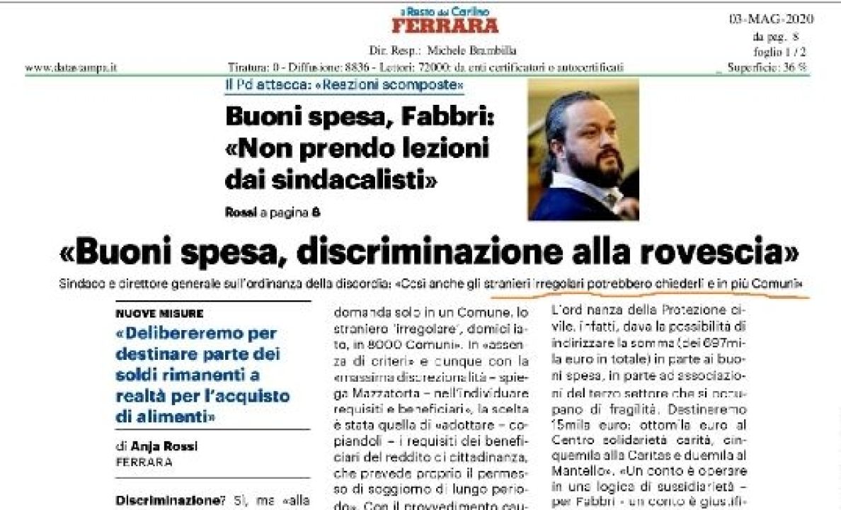 Riportiamo dal Carlino di ieri, 03-05-2020 (“Buoni spesa, discriminazione alla rovescia”)