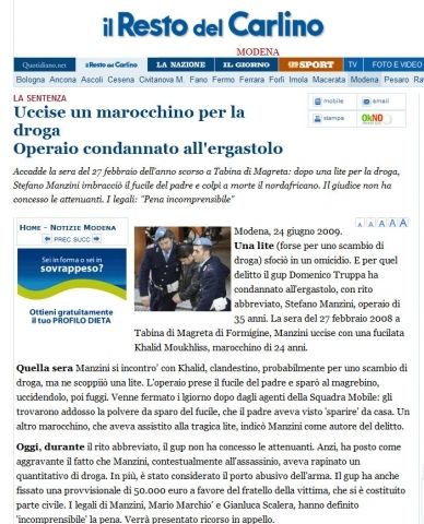 Modena, 24 giugno 2009. Una lite (forse per uno scambio di droga) sfociò in un omicidio. E per quel delitto il gup Domenico Truppa ha condannato all'ergastolo, con rito abbreviato, Stefano Manzini, operaio di 35 anni. La sera del 27 febbraio 2008 a Tabina di Magreta di Formigine, Manzini uccise con una fucilata Khalid Moukhliss, marocchino di 24 anni.