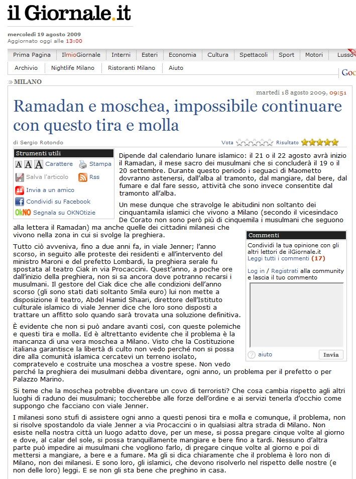 Dipende dal calendario lunare islamico: il 21 o il 22 agosto avrà inizio il Ramadan, il mese sacro dei musulmani che si concluderà il 19 o il 20 settembre. Durante questo periodo i seguaci di Maometto dovranno astenersi, dall’alba al tramonto, dal mangiare, dal bere, dal fumare e dal fare sesso, attività che sono invece consentite dal tramonto all’alba. Un mese dunque che stravolge le abitudini non soltanto dei cinquantamila islamici che vivono a Milano (secondo il vicesindaco De Corato non sono però più di cinquemila i musulmani che seguono alla lettera il Ramadan) ma anche quelle dei cittadini milanesi che vivono nella zona in cui si svolge la preghiera. Tutto ciò avveniva, fino a due anni fa, in viale Jenner; l’anno scorso, in seguito alle proteste dei residenti e all’intervento del ministro Maroni e del prefetto Lombardi, la preghiera serale fu spostata al teatro Ciak in via Procaccini. Quest’anno, a poche ore dall’inizio della preghiera, non si sa ancora dove potranno recarsi i musulmani. Il gestore del Ciak dice che alle condizioni dell’anno scorso (gli sono stati dati soltanto 5mila euro) lui non mette a disposizione il teatro, Abdel Hamid Shaari, direttore dell’Istituto culturale islamico di viale Jenner dice che loro sono disposti a trattare un affitto solo quando sarà trovata una soluzione definitiva. È evidente che non si può andare avanti così, con queste polemiche e questi tira e molla. Ed è altrettanto evidente che il problema è la mancanza di una vera moschea a Milano. Visto che la Costituzione italiana garantisce la libertà di culto non vedo perché non si possa dire alla comunità islamica cercatevi un terreno isolato, compratevelo e costruite una moschea a vostre spese. Non vedo perché la preghiera dei musulmani debba diventare, ogni anno, un problema per il prefetto o per Palazzo Marino. Si teme che la moschea potrebbe diventare un covo di terroristi? Che cosa cambia rispetto agli altri luoghi di raduno dei musulmani; toccherebbe alle forze dell’ordine e ai servizi tenerla d’occhio come suppongo che facciano con viale Jenner. I milanesi sono stufi di assistere ogni anno a questi penosi tira e molla e comunque, il problema, non si risolve spostandolo da viale Jenner a via Procaccini o in qualsiasi altra strada di Milano. Non esiste nella nostra città un luogo adatto dove, per un mese, si possa pregare cinque volte al giorno e dove, al calar del sole, si possa tranquillamente mangiare e bere fino a tardi. Nessuno d’altra parte può impedire ai musulmani che vogliono farlo, di pregare cinque volte al giorno e poi di mettersi a mangiare, a bere e a fumare. Ma gli si dica chiaramente che il problema è loro non di Milano, non dei milanesi. E sono loro, gli islamici, che devono risolverlo nel rispetto delle nostre (e non delle loro) leggi. E se non gli sta bene che preghino in casa.
