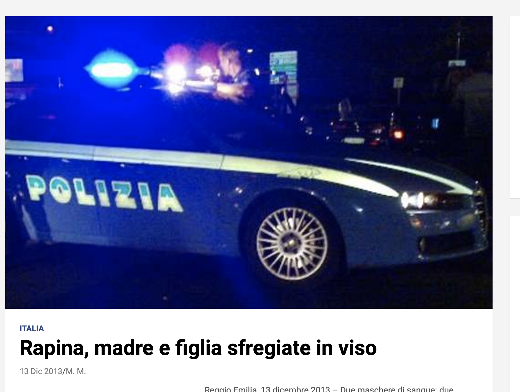 Reggio Emilia, 12 dicembre 2013 - DUE maschere di sangue: due donne, madre e figlia, lasciate in mezzo alla strada, ferite al volto. Alla polizia hanno raccontato, in prima battuta, di essere state colpite da un uomo. Uno sconosciuto che le ha avvicinate mirando probabilmente alla loro borsetta. Ma il coltello che aveva non si è limitato a puntarlo contro di loro, per intimorirle: lo ha usato ferendole entrambe in volto, per poi fuggire.