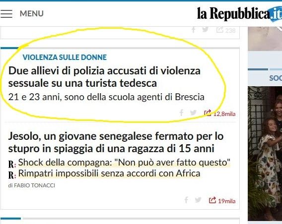 Prima pagina online de La Repubblica del 27-08-2018: la notizia è molto in fondo, chissà quante volte viene richiamata dal web in confronto allo stupro con senegalese? I riflettori sono puntati sugli stupratori, la libertà e la sicurezza delle donne rimane sempre in secondo piano.