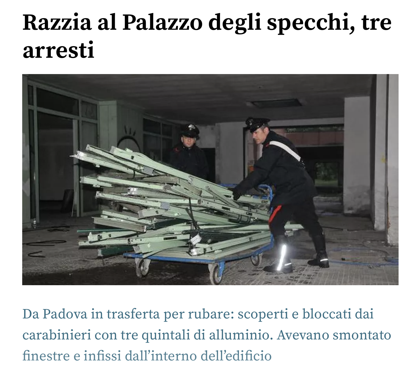 Perchè il colpo pensato in trasferta, l’hanno fatto in pieno giorno, ieri pomeriggio. Così i tre ladri, che abitano a Padova, sono stati arrestati dai carabinieri della Stazione Ferrara, impegnati in un servizio di prevenzione furti: i tre arrestati sono Trabelsi Sabri, tunisino, di 43 anni, pregiudicato; Hilacukaj Gjergj, albanese di 37 anni, pregiudicato che aveva un coltello a serramanico con lama di 12 cm, per cui è stato denunciato anche per possesso ingiustificato di armi; e infine C.D., italiano di 47 anni (dell’italiano sono state fornite solo le iniziali dai carabinieri, in quanto - la spiegazione fornita - l’uomo è incensurato). I militari in borghese, ieri pomeriggio alle 15.30, hanno arresto i tre, un italiano e due stranieri, per furto aggravato in concorso, all’interno del Palazzo degli specchi.