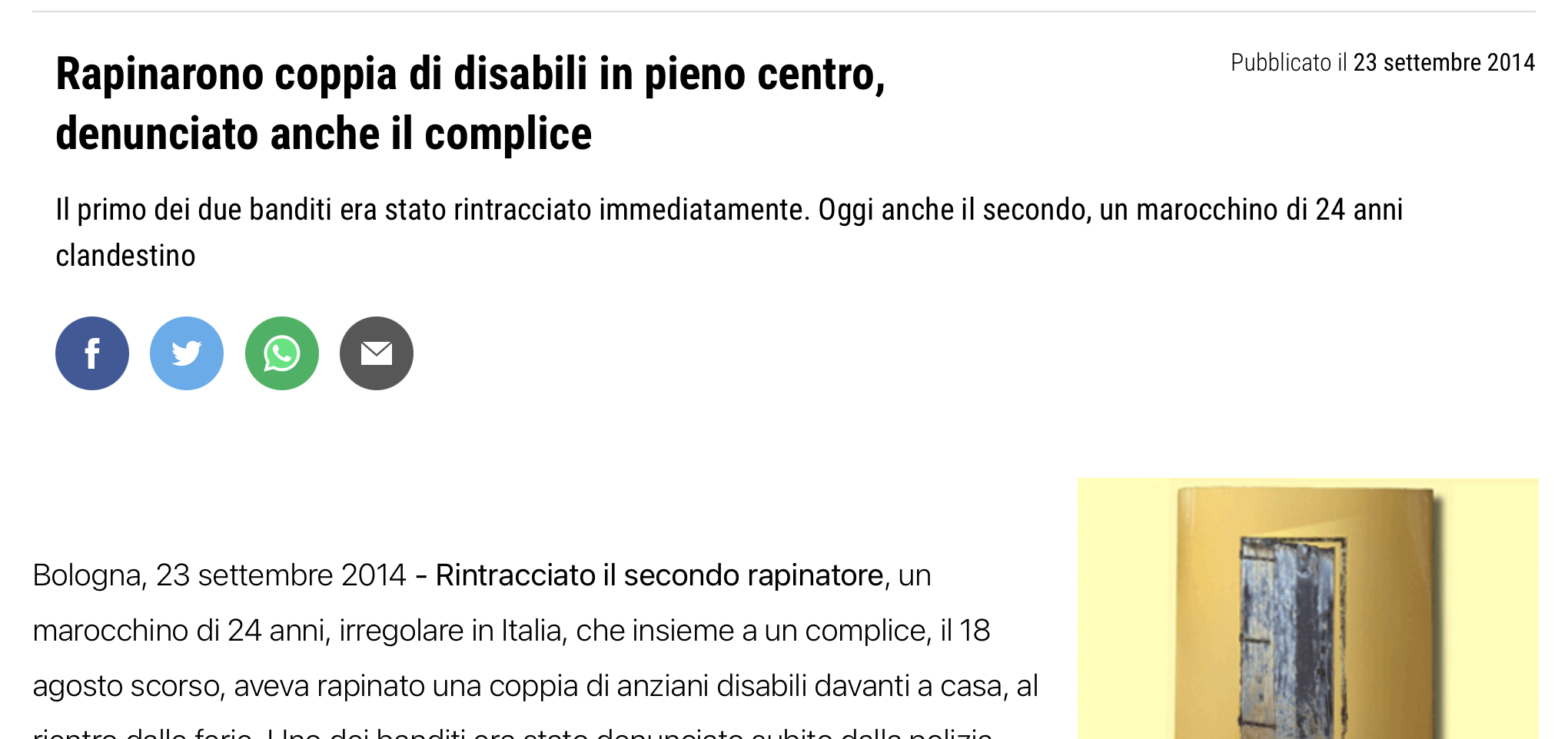 Rintracciato il secondo rapinatore, un marocchino di 24 anni, irregolare in Italia, che insieme a un complice, il 18 agosto scorso, aveva rapinato una coppia di anziani disabili davanti a casa, al rientro dalle ferie. Uno dei banditi era stato denunciato subito dalla polizia. L'aggressione era avvenuta in pieno giorno in via San Vitale: i coniugi, entrambi con problemi di mobilità, stavano scaricando i bagagli dalla macchina, quando due nordafricani si erano avvicinati e avevano portato via due zaini dall'abitacolo.