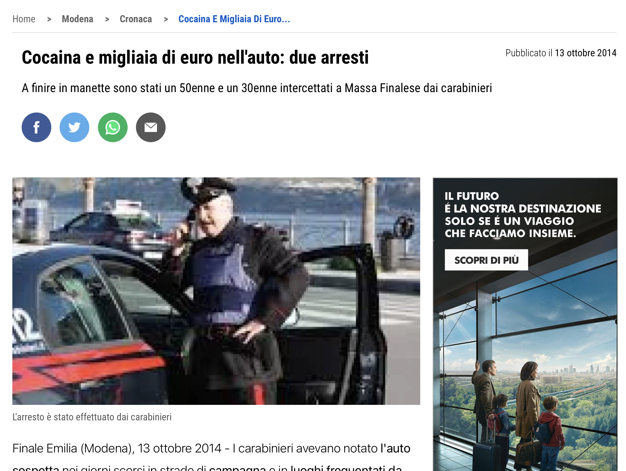 Finale Emilia (Modena), 13 ottobre 2014 - I carabinieri avevano notato l'auto sospetta nei giorni scorsi in strade di campagna e in luoghi frequentati da giovani. Così, quando i militari dell'Arma di Finale Emilia (Modena) hanno intercettato la macchina a Massa Finalese, sono scattati i controlli e gli arresti. A finire in manette sono stati un 50enne e un 30enne del Nord Africa, che in auto avevano, nascosto nel cruscotto, un pacchetto di sigarette con 11 dosi di cocaina e sotto il sedile una busta contenente altra droga dello stesso tipo, per un totale di quasi 200 grammi.