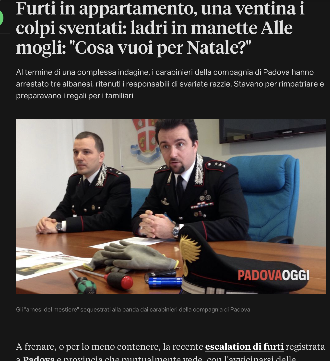 Furti in appartamento a Padova: ladri arrestati „Furti in appartamento, una ventina i colpi sventati: ladri in manette Alle mogli: "Cosa vuoi per Natale?"
