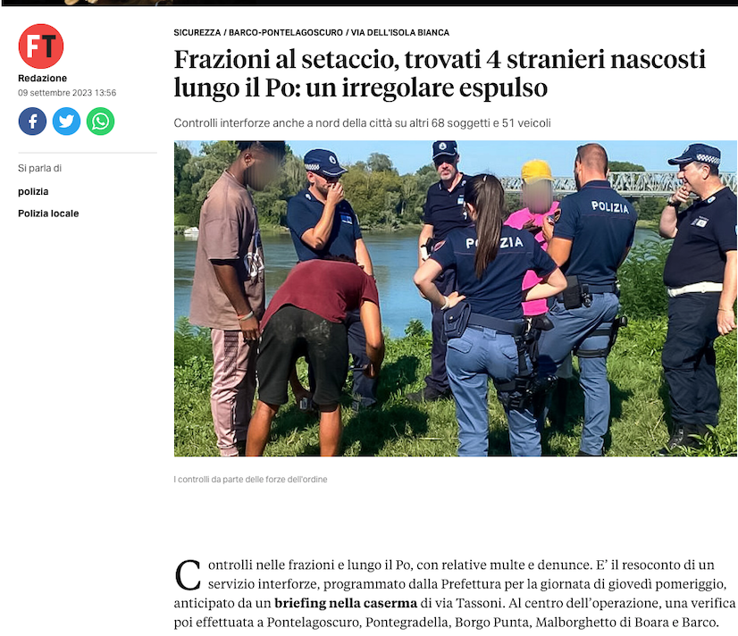 Se questo si può chiamare giornalismo. Infatti la stessa notizia si trova su La Nuova Ferrara (10-09-2023): la stessa foto, le stesse frasi (“un documento di soggiorno ritenuto non idoneo”, “l’immigrazione clandestina e l’uso di sostanze stupefacenti”).