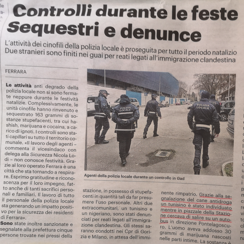 "Grazie alla segnalazione del cane antidroga un tunisino è stato individuato mentre in piazzale della Stazione cercava di salire su un autobus..." (Resto del Carlino Ferrara, 10-01-24)