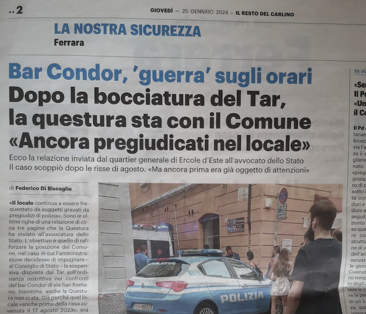 Continua la persecuzione mediatica* dei proprietari del Bar Condor per aver osato opporsi alla campagna anti-stranieri del Comune di Ferrara.