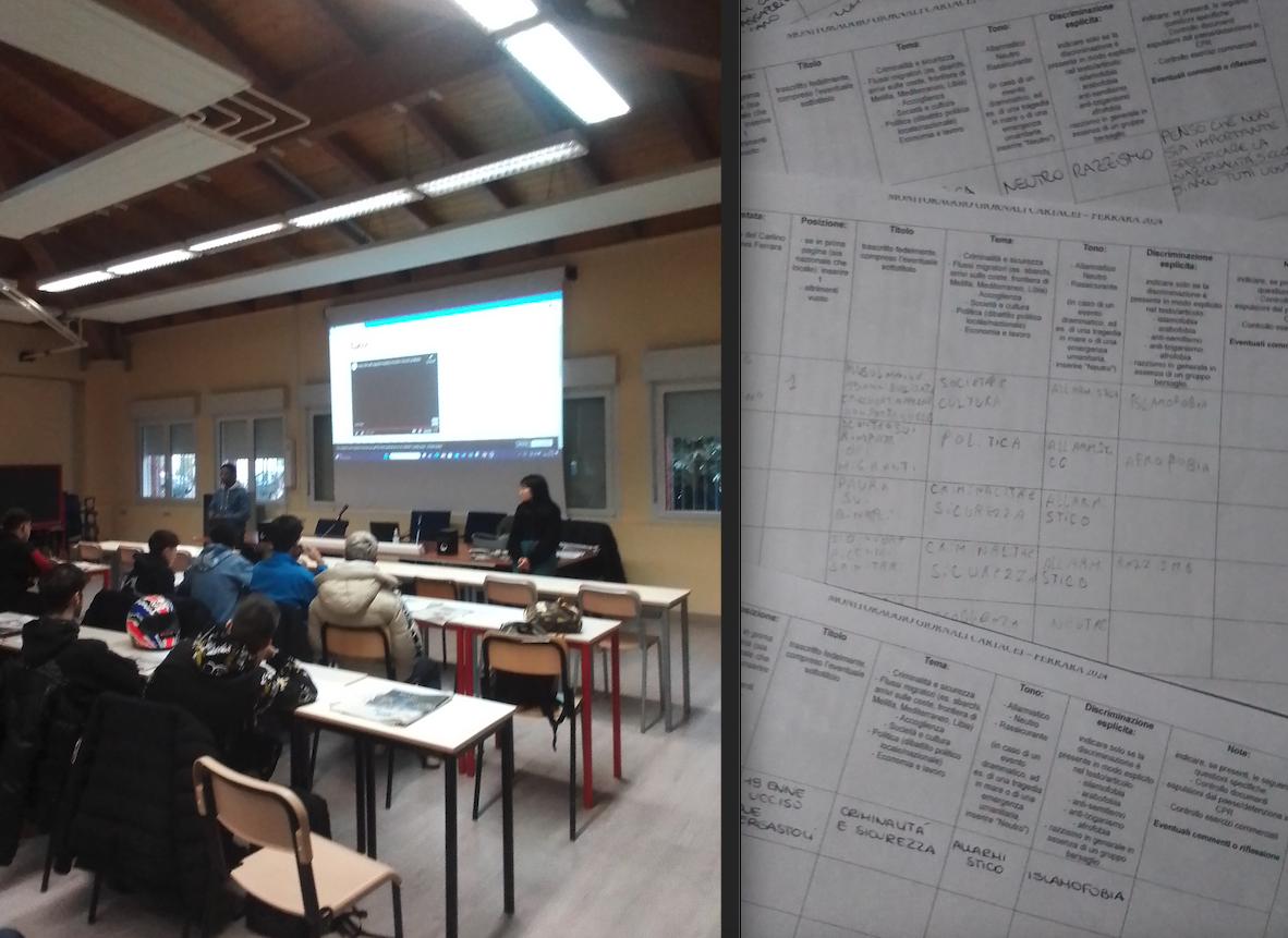 Nel dicembre 2024 Occhioaimedia ha avuto due incontri con gli studenti della scuola superiore di Portomaggiore. Insieme, applicando le categorie stabilite da Carta di Roma, abbiamo analizzato il trattamento mediatico del tema dell'immigrazione nei quotidiani cartacei di Ferrara per il mese di novembre 2024. I risultati del monitoraggio saranno pubblicati a breve. Durante il secondo incontro abbiamo proiettato il video di Occhioaimedia sulle donne nigeriane richiedenti asilo respinte dal paese di Gorino nel 2016, "Oltre le bariccate" (https://www.occhioaimedia.org/?view=article&id=1561&catid=93).