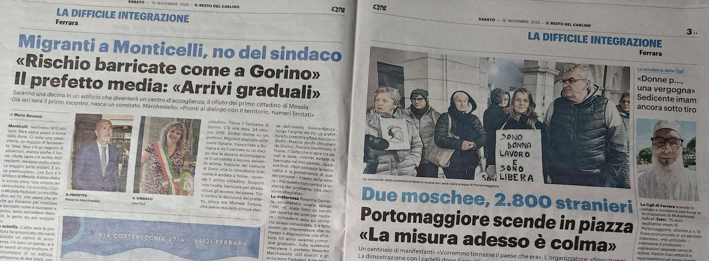 A completare, altra pagina intera, la notizia dell’arrivo di una decina di richiedenti asilo con la minaccia della sindaca di destra di erigere barricate per rifiutare la decisione del Prefetto e alimentare nuova paura.