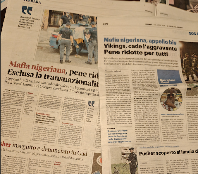 Su entrambi i quotidiani (Resto del Carlino Ferrara e La Nuova Ferrara, 10-04-2026), l'articolo sulla riduzione delle pene per i membri della mafia nigeriana è affiancato da un altro articolo sulla criminalità nigeriana, anche se il secondo articolo si riferisce a un episodio avvenuto “nei giorni scorsi”.