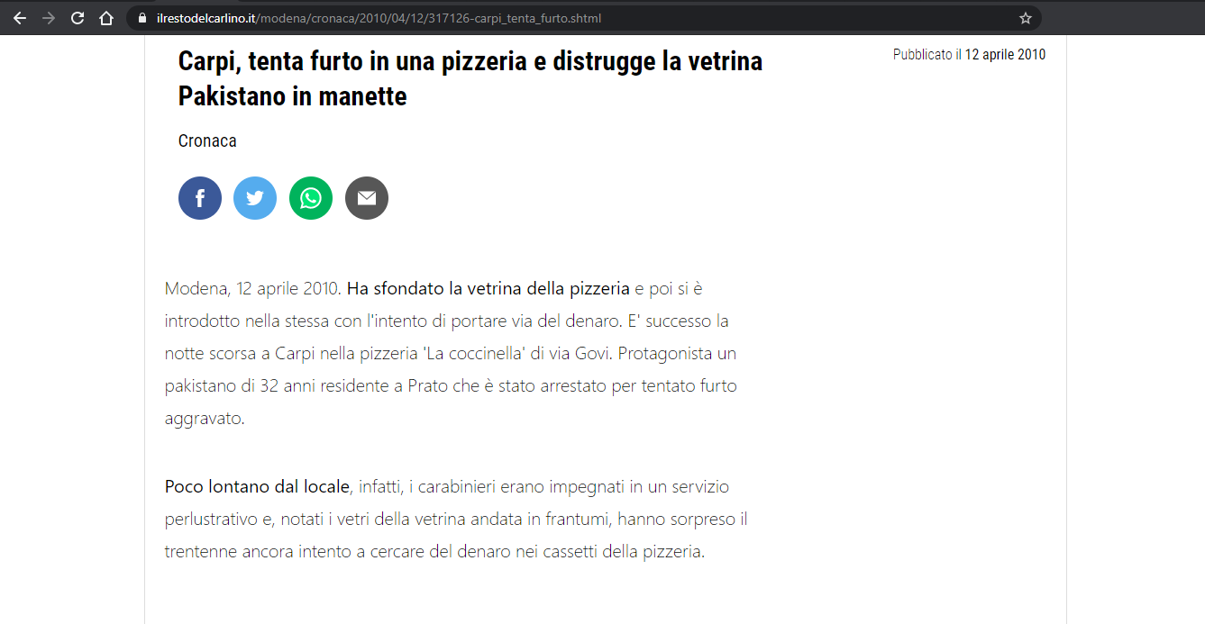 Carpi, tenta furto in una pizzeria e distrugge la vetrina Pakistano in manette