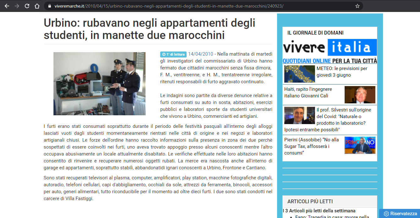 Urbino, 14 aprile 2010 - Avevano messo nel mirino dei loro furti gli appartamenti degli studenti universitari di Urbino, all'interno dei quali rubavano televisori al plasma, computers, playstation e altri oggetti di valore. Per questo gli investigatori di Urbino, coordinati dal dirigente Antonio Sguanci, hanno arrestato due cittadini marocchini, F.M. ventitreenne senza fissa dimora e H.M., trentatreenne senza fissa dimora ed irregolare sul territorio nazionale, ritenuti responsabili di furto aggravato continuato.