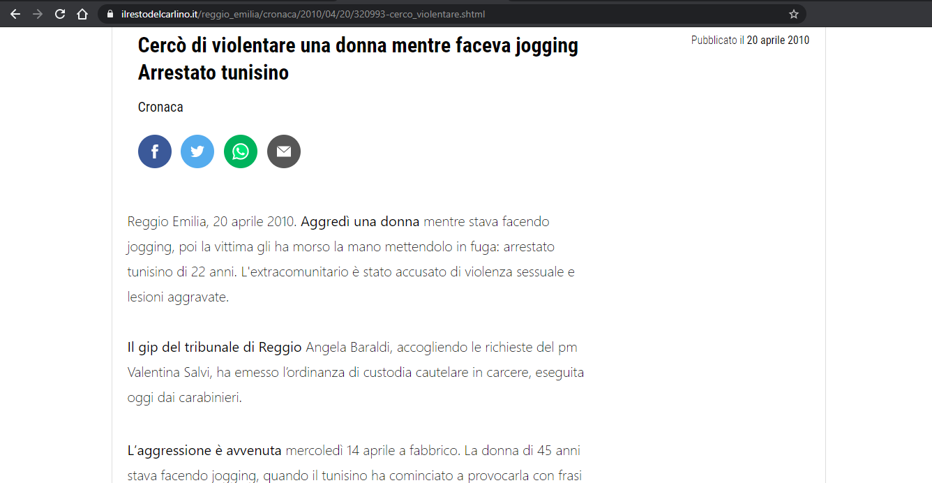 Reggio Emilia, 20 aprile 2010. Aggredì una donna mentre stava facendo jogging, poi la vittima gli ha morso la mano mettendolo in fuga: arrestato tunisino di 22 anni. L'extracomunitario è stato accusato di violenza sessuale e lesioni aggravate.