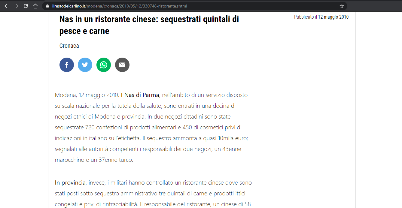 [...] I Nas di Parma, nell'ambito di un servizio disposto su scala nazionale per la tutela della salute, sono entrati in una decina di negozi etnici di Modena e provincia [...] segnalati alle autorità competenti i responsabili dei due negozi, un 43enne marocchino e un 37enne turco [...] In provincia, invece, i militari hanno controllato un ristorante cinese [...] Il responsabile del ristorante, un cinese di 58 anni,