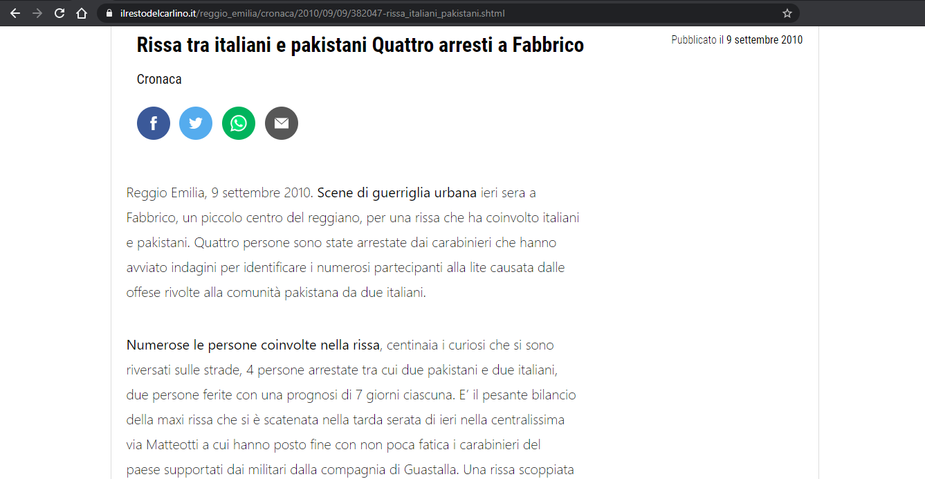 Le cause sarebbero da ricondurre alla “reazione” dei pakistani alle offese gratuite a loro rivolte da due italiani. Quattro gli arrestati: due pakistani e due italiani. Per questi ultimi prognosi di 7 giorni per traumi facciali e cranici [...] Scene di guerriglia urbana ieri sera a Fabbrico, un piccolo centro del reggiano, per una rissa che ha coinvolto italiani e pakistani.