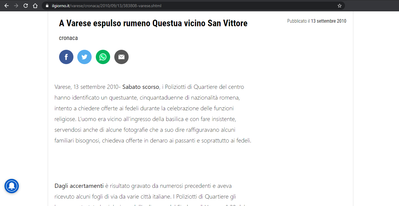 [...] i Poliziotti di Quartiere del centro hanno identificato un questuante, cinquantaduenne di nazionalità romena, intento a chiedere offerte ai fedeli durante la celebrazione delle funzioni religiose. L’uomo era vicino all’ingresso della basilica e con fare insistente, servendosi anche di alcune fotografie che a suo dire raffiguravano alcuni familiari bisognosi, chiedeva offerte in denaro ai passanti e soprattutto ai fedeli [...]