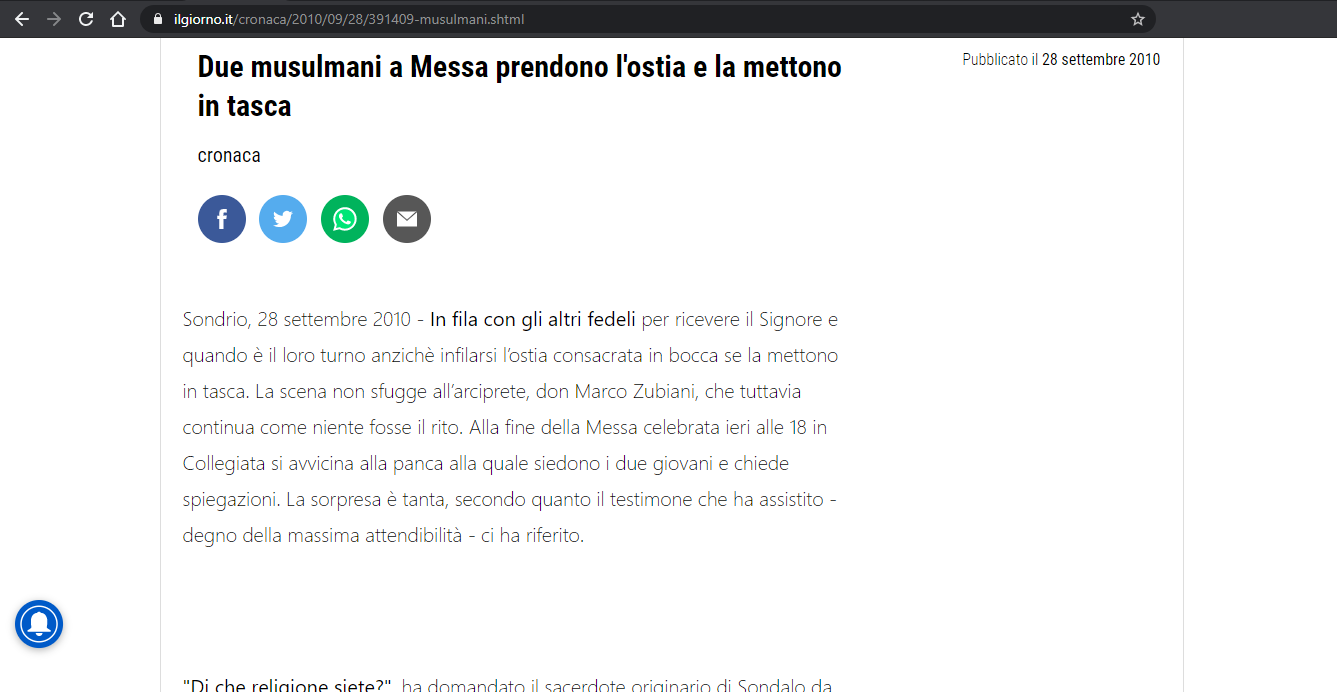 «Siamo musulmani», rispondono i due, forse slavi, forse albanesi sui 25 anni. Ci sono stati alcuni interminabili minuti di tensione, non privi di voci alterate da parte dei due presunti provocatori islamici [...] Un episodio - in parte configurabile come vilipendio alla religione -spia di una convivenza ancora difficile fra etnie e religioni diverse.