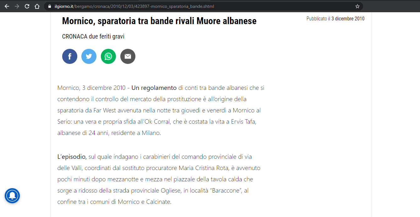 Un regolamento di conti tra bande albanesi che si contendono il controllo del mercato della prostituzione è all’origine della sparatoria da Far West avvenuta nella notte tra giovedì e venerdì a Mornico al Serio: una vera e propria sfida all’Ok Corral, che è costata la vita a Ervis Tafa, albanese di 24 anni, residente a Milano.