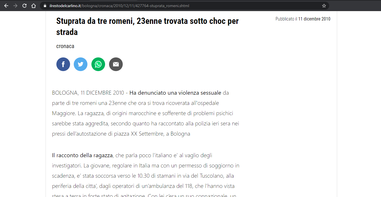 Ha denunciato una violenza sessuale da parte di tre romeni una 23enne [...] La vittima, una giovane marocchina regolare, ha raccontato agli agenti della violenza sessuale avvenuta durante la notte. [...] La marocchina e’ stata portata in ospedale per medicare alcune lievi ferite che si sarebbe procurata da sola, e per gli accertamenti relativi all’eventuale violenza sessuale.