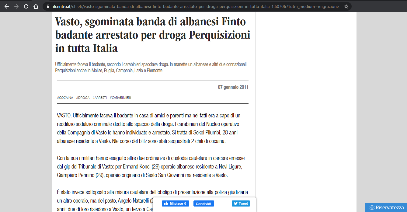 I carabinieri del Nucleo operativo della Compagnia di Vasto lo hanno individuato e arrestato. Si tratta di Sokol Pllumbi, 28 anni albanese