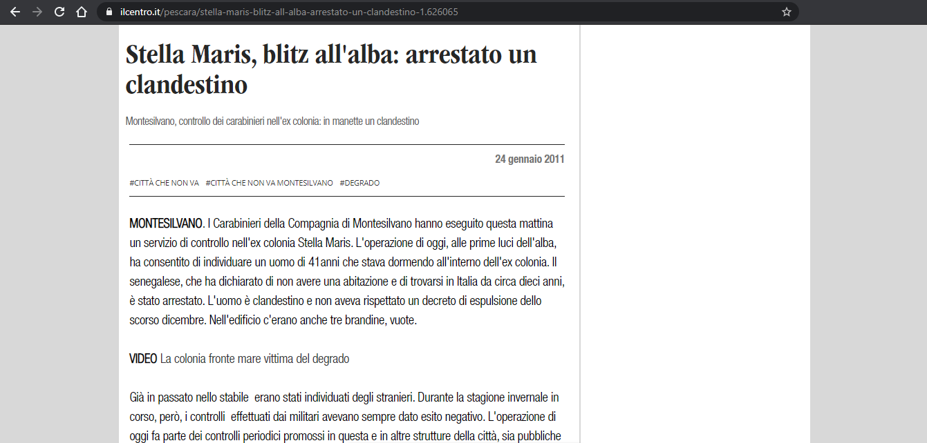 Montesilvano, controllo dei carabinieri nell'ex colonia: in manette un clandestino. L'operazione di oggi, alle prime luci dell'alba, ha consentito di individuare un uomo di 41anni che stava dormendo all'interno dell'ex colonia. Il senegalese è stato arrestato.