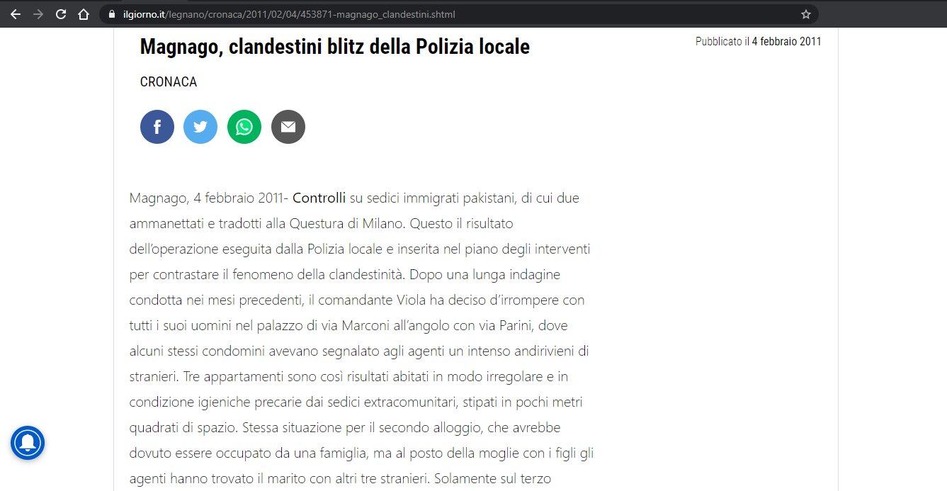 Controlli su sedici immigrati pakistani, di cui due ammanettati e tradotti alla Questura di Milano. [...] il comandante Viola ha deciso d’irrompere con tutti i suoi uomini nel palazzo di via Marconi [...] Tre appartamenti sono così risultati abitati in modo irregolare e in condizione igieniche precarie dai sedici extracomunitari, stipati in pochi metri quadrati di spazio.