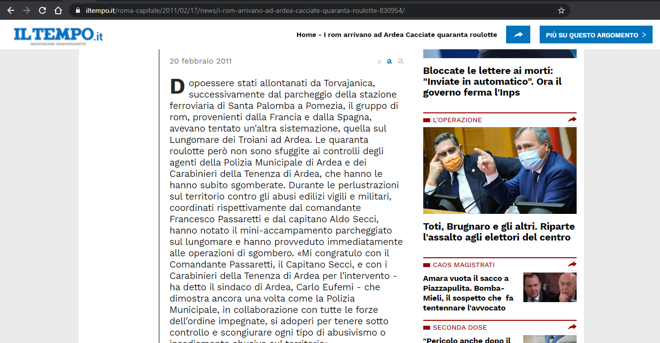 È stato scongiurato ad Ardea l'insediamento di circa 40 roulotte di nomadi rom grazie all'intervento delle forze dell'ordine. [...] Dopo essere stati allontanati da Torvajanica, successivamente dal parcheggio della stazione ferroviaria di Santa Palomba a Pomezia, il gruppo di rom, provenienti dalla Francia e dalla Spagna, avevano tentato un'altra sistemazione, quella sul Lungomare dei Troiani ad Ardea. Le quaranta roulotte però non sono sfuggite ai controlli degli agenti della Polizia Municipale di Ardea e dei Carabinieri della Tenenza di Ardea, che hanno le hanno subito sgomberate.