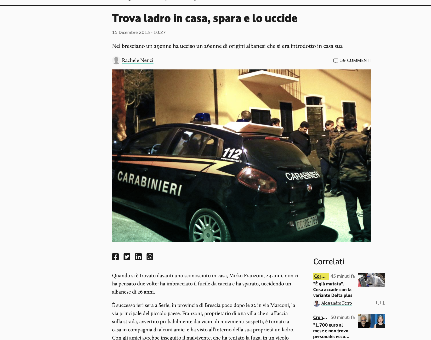 Quando si è trovato davanti uno sconosciuto in casa, Mirko Franzoni, 29 anni, non ci ha pensato due volte: ha imbracciato il fucile da caccia e ha sparato, uccidendo un albanese di 26 anni...Con gli amici avrebbe inseguito il malvivente, che ha tentato la fuga, in un vicolo vicino all’abitazione. Una volta raggiunto, sarebbe nata una colluttazione tra il proprietario di casa, gli amici e il giovane ladro. Improvvisamente sarebbe partito un colpo di fucile che ha ucciso il 26enne di origini albanesi.
