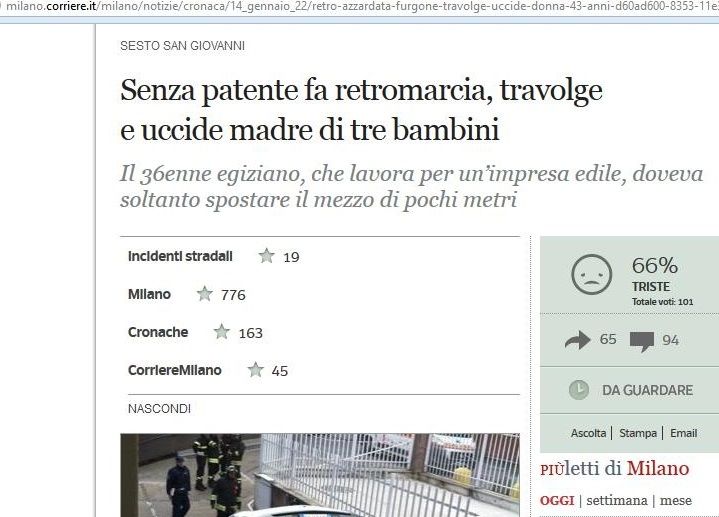 Senza patente fa retromarcia, travolge e uccide madre di tre bambini