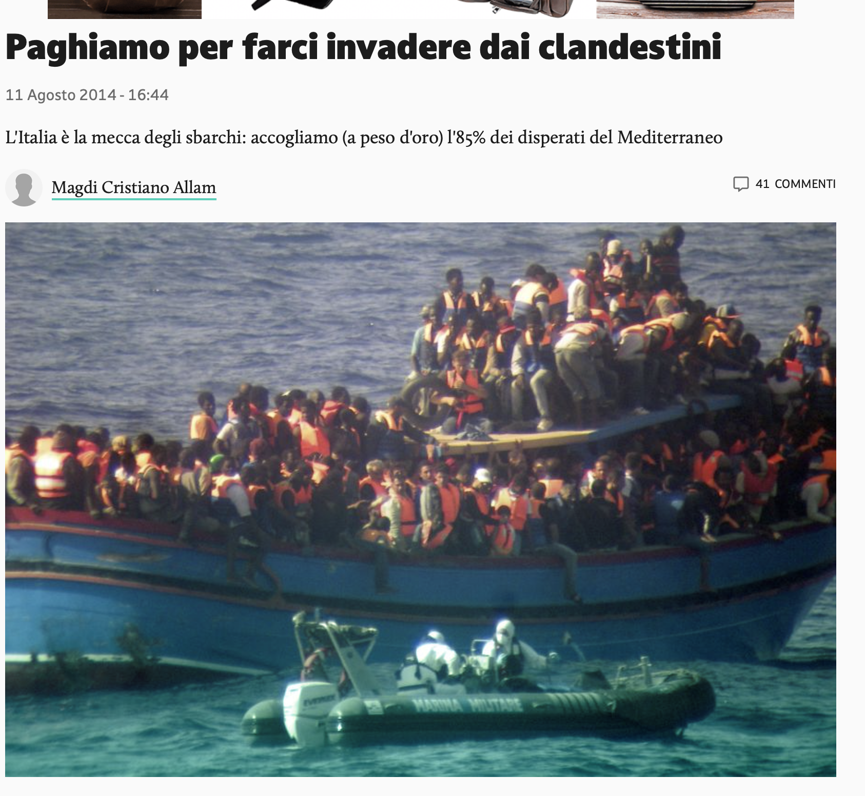 ...siamo l'unico Stato al mondo che sta investendo le proprie risorse per farsi auto-invadere, dedicando le proprie forze navali ed aeronautiche per prelevare i clandestini imbarcati su fatiscenti carrette del mare, spingendosi fino al limite delle acque territoriali straniere, per portarli a bordo delle nostre sicure imbarcazioni sulle nostre coste.