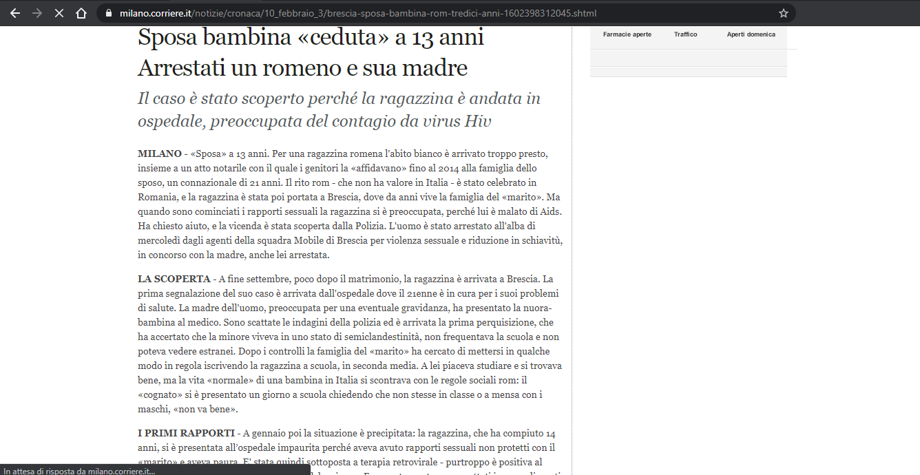 Il caso è stato scoperto perché la ragazzina è andata in ospedale, preoccupata del contagio da virus Hiv ... MILANO - «Sposa» a 13 anni. Per una ragazzina romena l'abito bianco è arrivato troppo presto, insieme a un atto notarile con il quale i genitori la «affidavano» fino al 2014 alla famiglia dello sposo, un connazionale di 21 anni. Il rito rom - che non ha valore in Italia - è stato celebrato in Romania, e la ragazzina è stata poi portata a Brescia, dove da anni vive la famiglia del «marito». Ma quando sono cominciati i rapporti sessuali la ragazzina si è preoccupata, perché lui è malato di Aids. Ha chiesto aiuto, e la vicenda è stata scoperta dalla Polizia. L'uomo è stato arrestato all'alba di mercoledì dagli agenti della squadra Mobile di Brescia per violenza sessuale e riduzione in schiavitù, in concorso con la madre, anche lei arrestata.