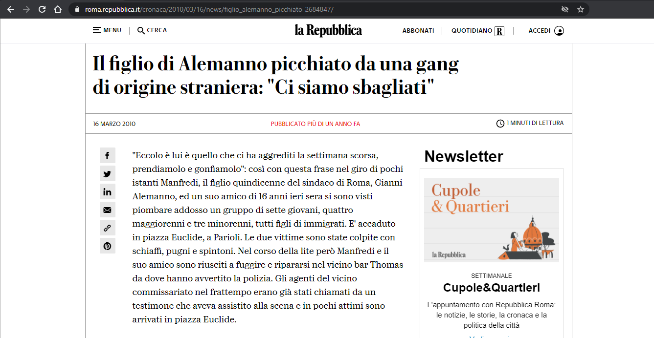 ...Tuttavia il movente politico o razzista è stato escluso pressoché all'istante: la polizia pare infatti orientata a classificare l'episodio come lite di strada....i sette aggressori: tutti studenti - alcuni di scuola superiore, altri universitari - nati in Italia ma di origine capoverdina e filippina.