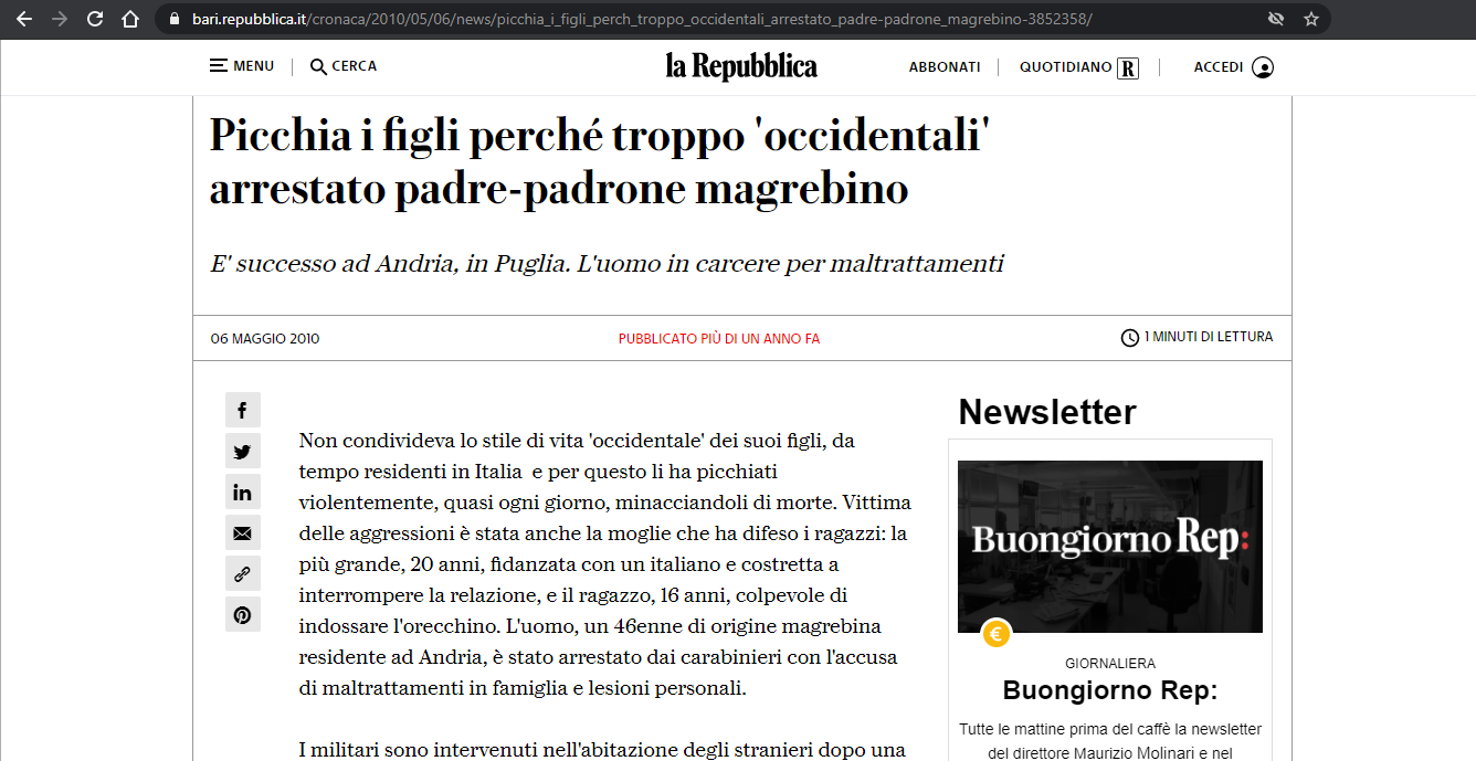 [...]L'uomo, un 46enne di origine magrebina residente ad Andria, è stato arrestato dai carabinieri con l'accusa di maltrattamenti in famiglia e lesioni personali. [...] I militari sono intervenuti nell'abitazione degli stranieri dopo una segnalazione al "112". [...]