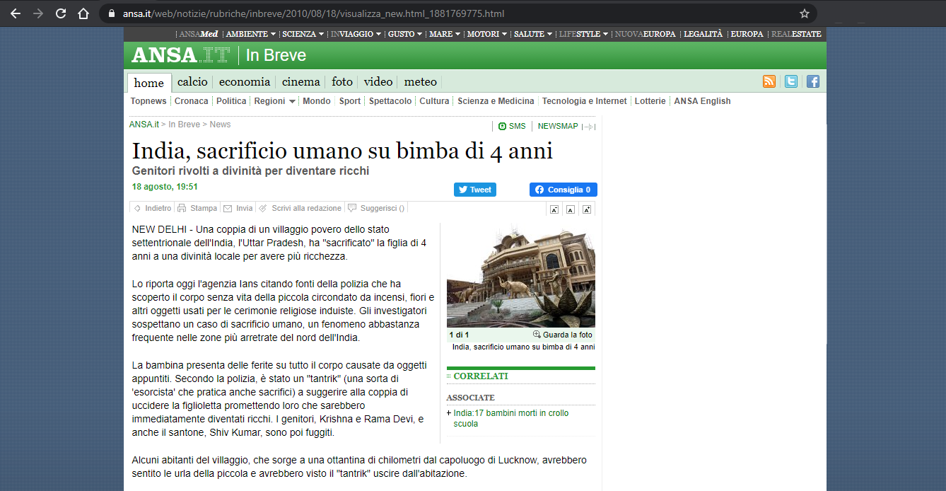 India: sacrificio umano su una bambina di 4 anni