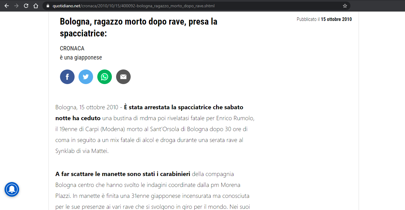 Bologna, ragazzo morto dopo rave, presa la spacciatrice: è una giapponese