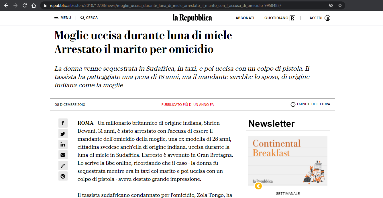 [...] Il tassista ha patteggiato una pena di 18 anni ma il mandante sarebbe lo sposo, di origine indiana come la moglie [...] .