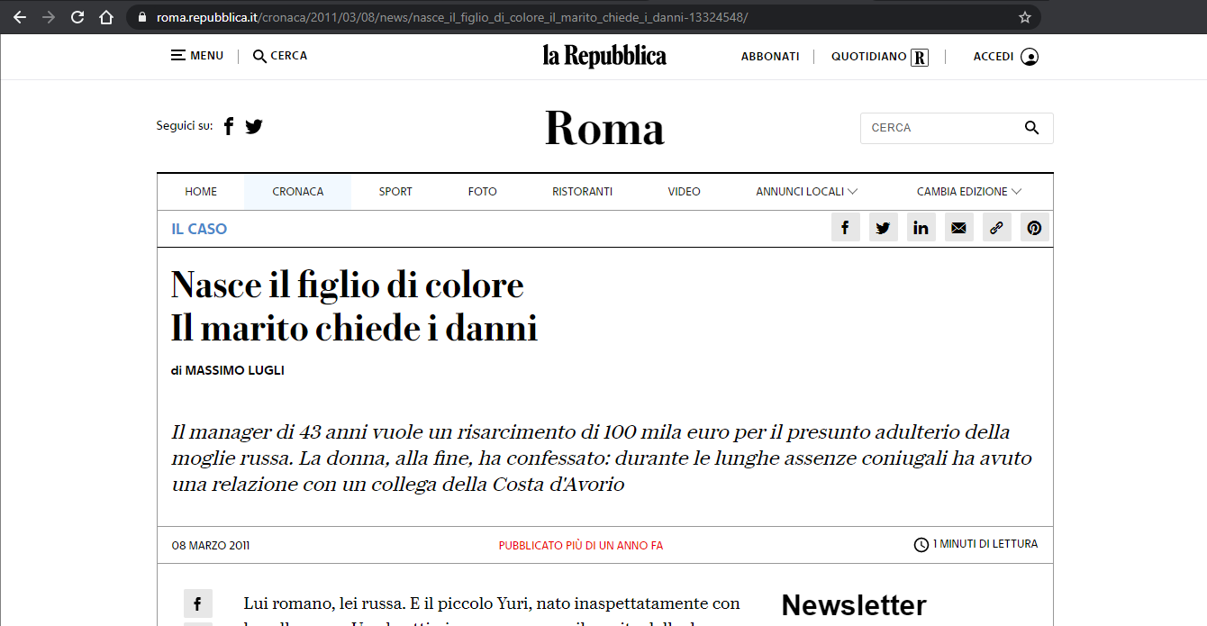Lui romano, lei russa. E il piccolo Yuri, nato inaspettatamente con la pelle scura. Una bruttissima sorpresa per il marito della donna ...ha chiesto la separazione per colpa e un risarcimento di 100 mila euro per l'adulterio multietnico