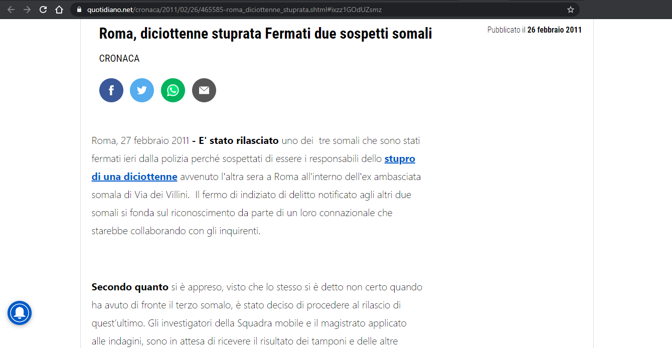 E' stato rilasciato uno dei tre somali che sono stati fermati ieri dalla polizia perché sospettati di essere i responsabili dello stupro di una diciottenne avvenuto l'altra sera a Roma all'interno dell'ex ambasciata somala di Via dei Villini. Il fermo di indiziato di delitto notificato agli altri due somali si fonda sul riconoscimento da parte di un loro connazionale che starebbe collaborando con gli inquirenti.