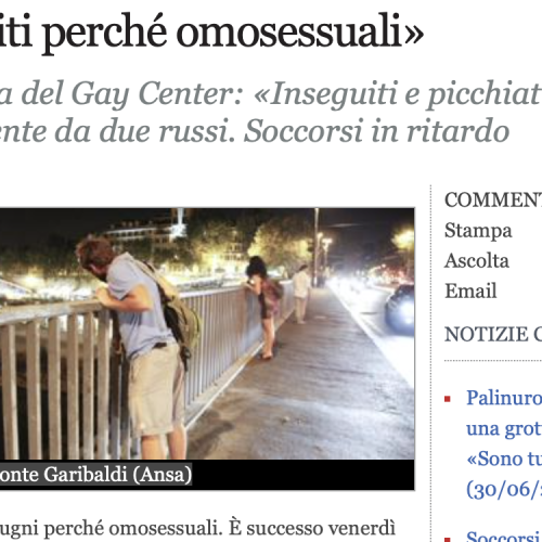 La denuncia del Gay Center: «Inseguiti e picchiati probabilmente da due russi. Soccorsi in ritardo…